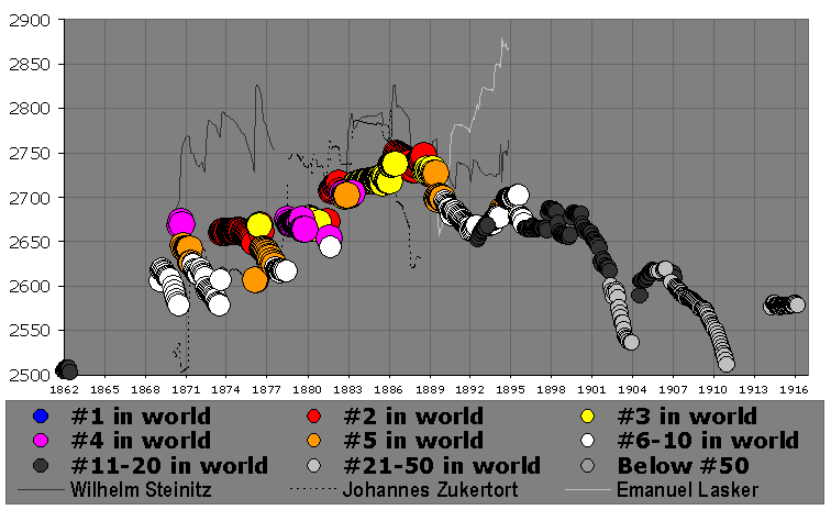 | Best Individual Performance: | 2785 in Frankfurt, 1887, scoring 10/12 (83%) vs 2613-rated opposition |