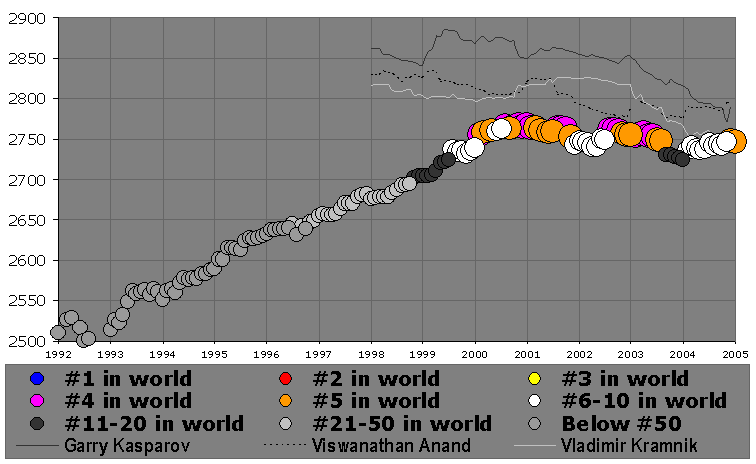 | Best Individual Performance: | 2806 in Dortmund (Candidates Final), 2002, scoring 8.5/13 (65%) vs 2744-rated opposition |