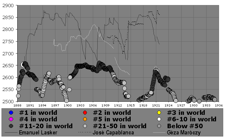 | Best Individual Performance: | 2764 in Ostend, 1907, scoring 15/20 (75%) vs 2596-rated opposition |