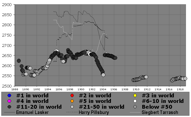 | Best Individual Performance: | 2757 in Janowsky-Showalter III (Brooklyn), 1899, scoring 4.5/7 (64%) vs 2749-rated opposition |