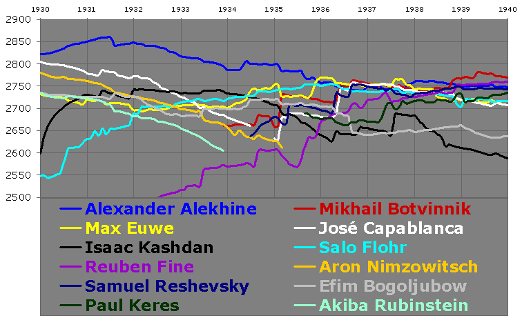 | The player who was ranked #1 most often between 1930 and 1940 was Alexander Alekhine, with 83 different months as the top-ranked player (a total of 6.9 years). Next on the list were Mikhail Botvinnik (1.7 years) and Max Euwe (1.2 years). |