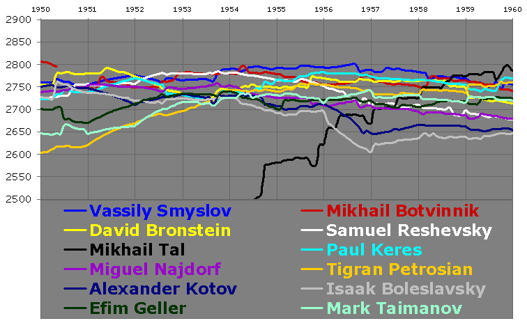 | The player who was ranked #1 most often between 1950 and 1960 was Vassily Smyslov, with 59 different months as the top-ranked player (a total of 4.9 years). Next on the list were David Bronstein (1.6 years) and Mikhail Botvinnik (1.4 years). |