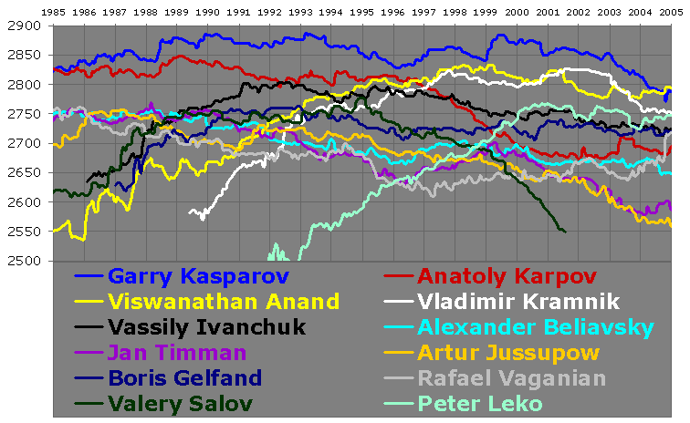 | The player who was ranked #1 most often between 1985 and 2005 was Garry Kasparov, with 237 different months as the top-ranked player (a total of 19.8 years). Next on the list was Viswanathan Anand (0.2 years), the only other player to be ranked #1 between 1985 and 2005. |