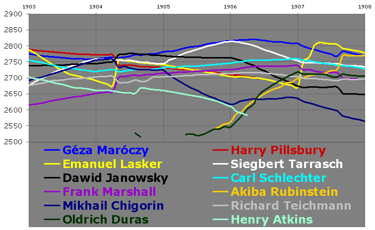 | The player who was ranked #1 most often between 1903 and 1908 was Géza Maróczy, with 30 different months as the top-ranked player (a total of 2.5 years). Next on the list were Harry Pillsbury (1.3 years) and Emanuel Lasker (0.8 years). |