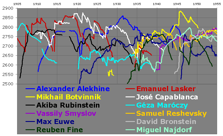 | The player who was ranked #1 most often between 1905 and 1955 was Emanuel Lasker, with 141 different months as the top-ranked player (a total of 11.8 years). Next on the list were Mikhail Botvinnik (10.8 years) and Alexander Alekhine (10.2 years). |