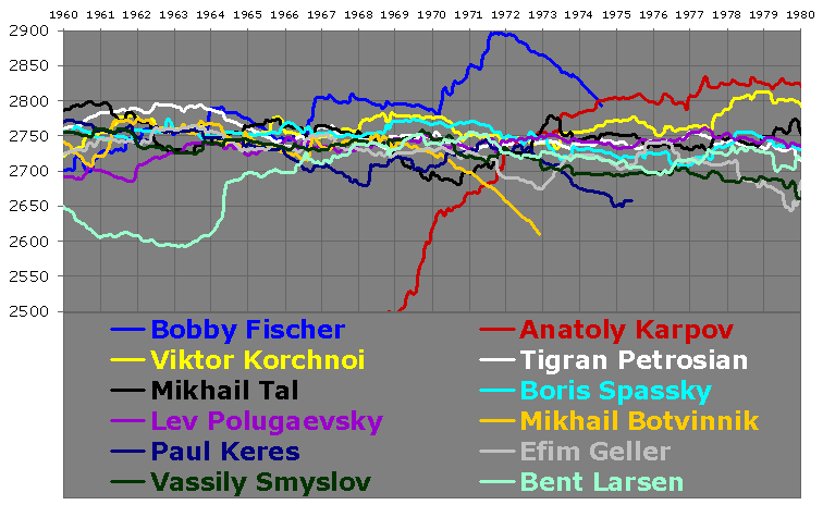 | Bobby Fischer: 2887 in Fischer-Larsen Match (Candidates semifinal, Denver), 1971 |