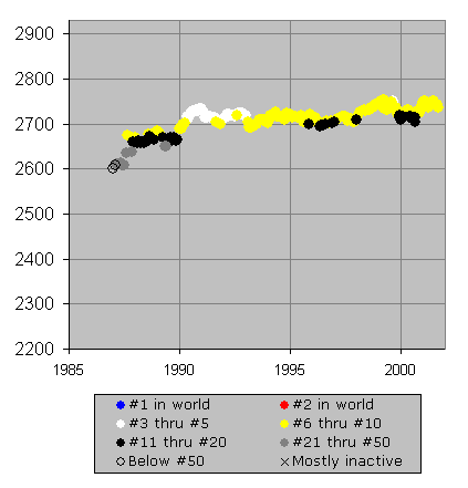 If a player has an insufficient number of games in recent years, there may be gaps in the list, even though you may see ratings listed on previous and/or subsequent dates. Whenever a player has played no rated games for three straight years, or dies,