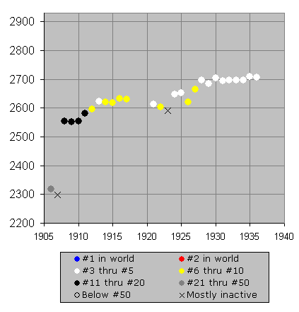 If a player has an insufficient number of games in recent years, there may be gaps in the list, even though you may see ratings listed on previous and/or subsequent dates. Whenever a player has played no rated games for three straight years, or dies,